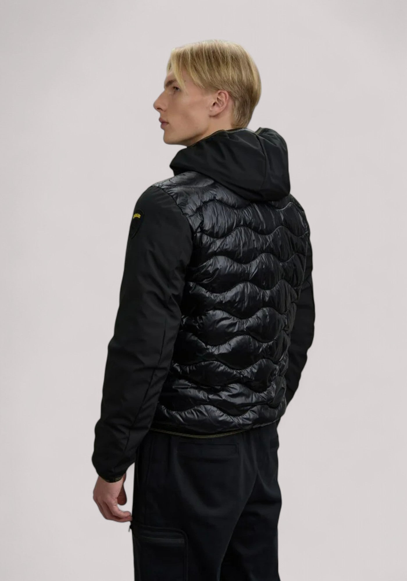 Piumino monocromatico in neoprene leggero e liscio sulle maniche e in nylon lucido impunturato ad onde sul corpo. Imbottitura mista per avere caldo anche in condizioni meteo avverse.