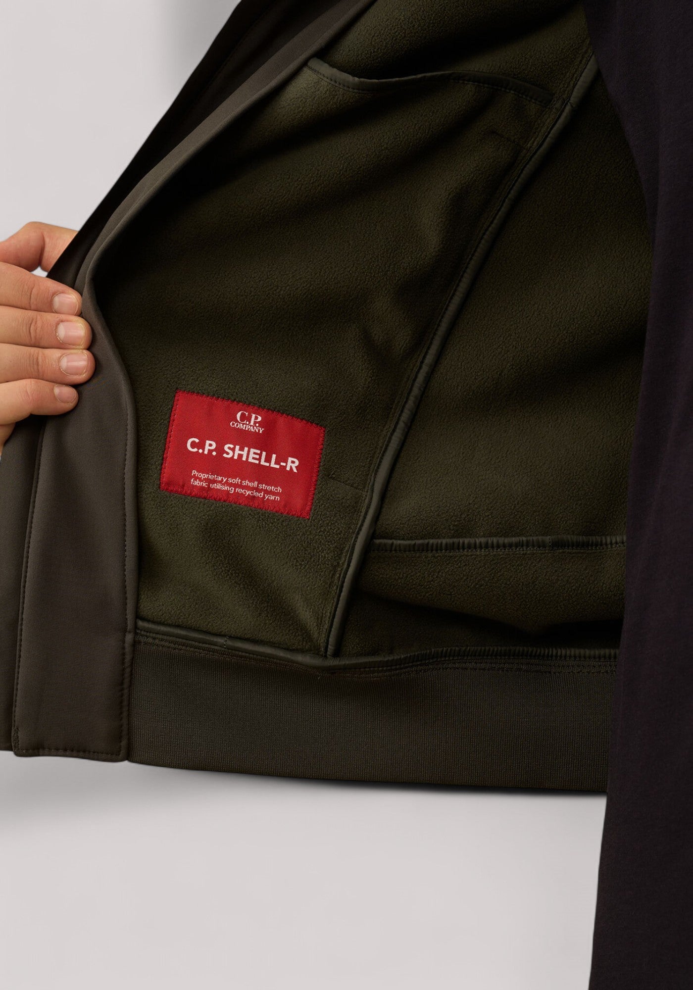 Giubbino con cappuccio realizzata in C.P. Shell-R, un softshell stretch a 3 strati in poliestere multifilamento riciclato, certificato secondo il Global Recycled Standard (GRS). Dotata di cappuccio regolabile, chiusura full zip a doppio cursore, tasche laterali con zip e l’iconica Lente di C.P. Company. I polsini e l'orlo posteriore a costine completano il design. Resistente per una colonna d’acqua di 5000 mm, garantendo protezione antivento. Trattato anti-goccia. Regular fit.