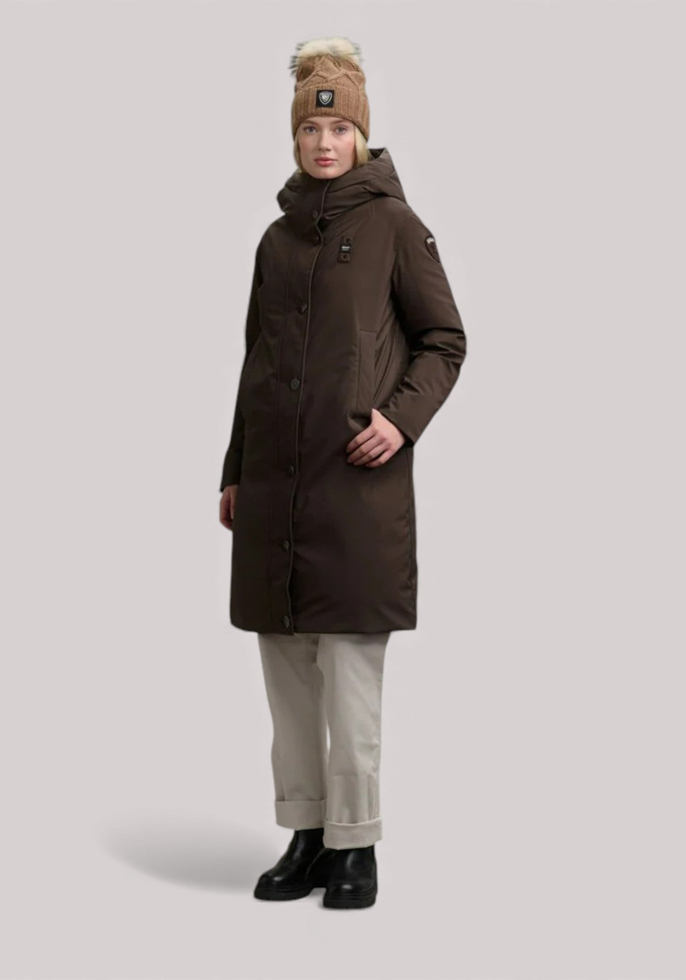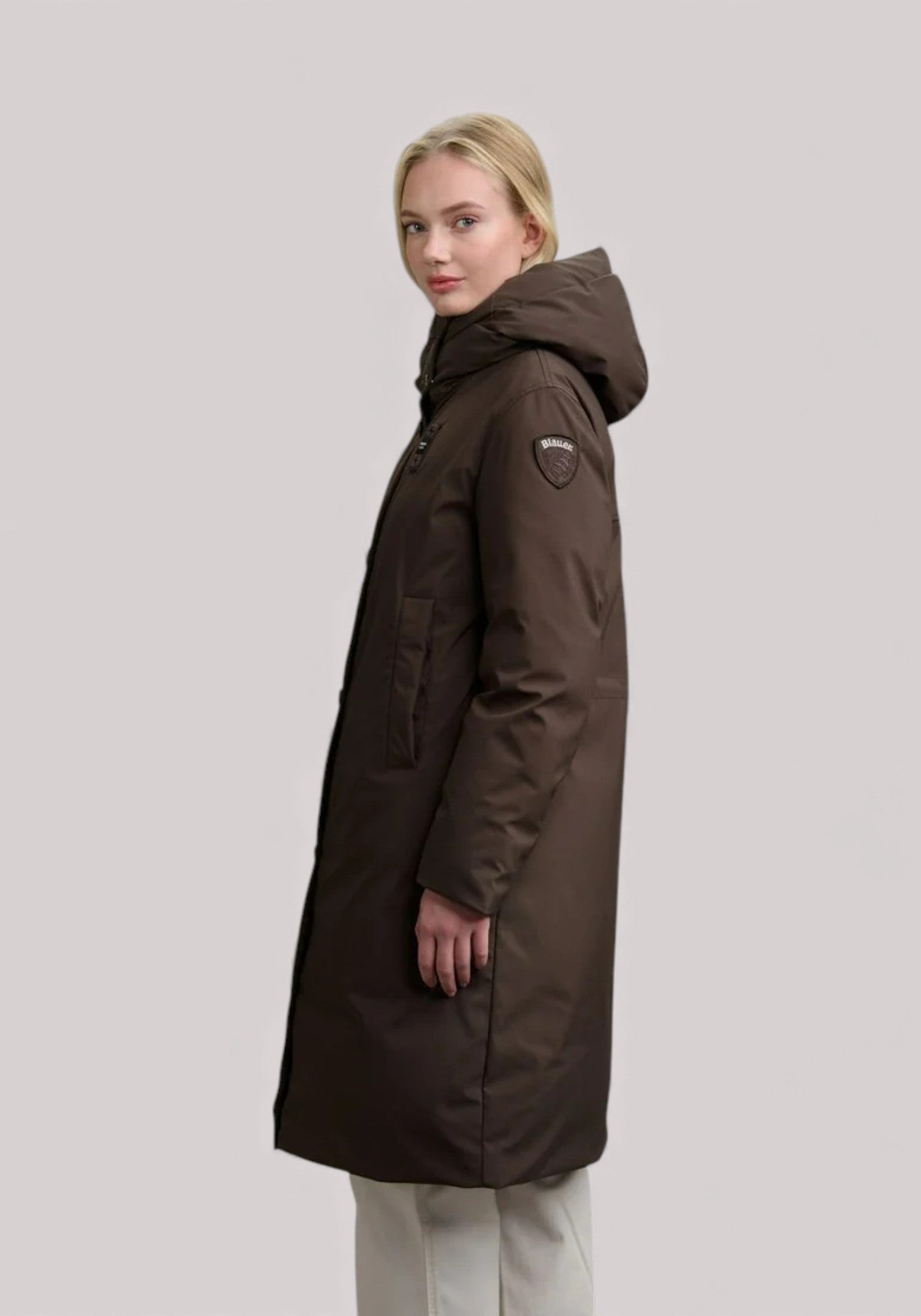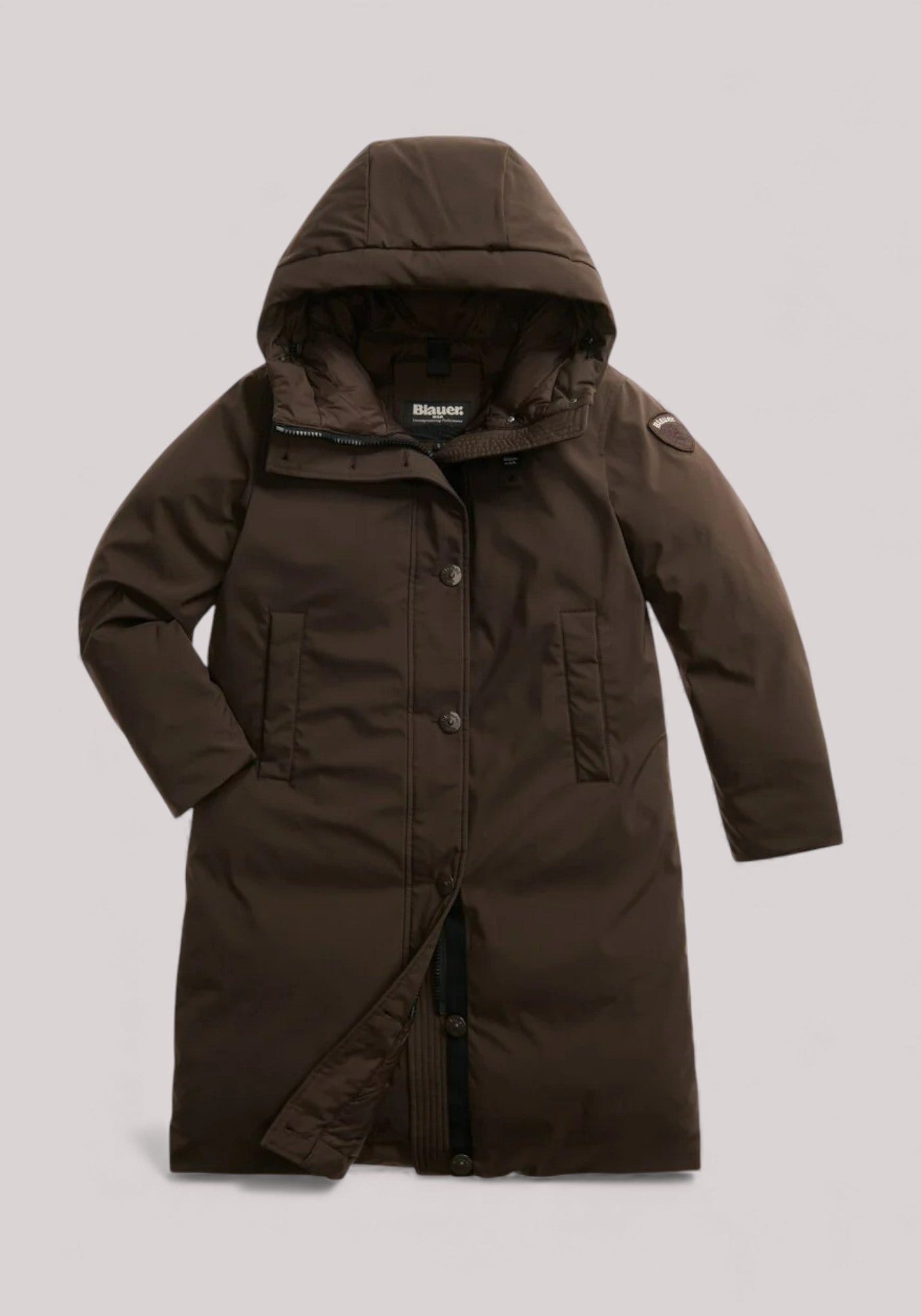Long parka in smooth water-repellent neoprene with fixed hood. Mixed padding that combines comfort and warmth. Iconic Blauer garment with military inspiration.