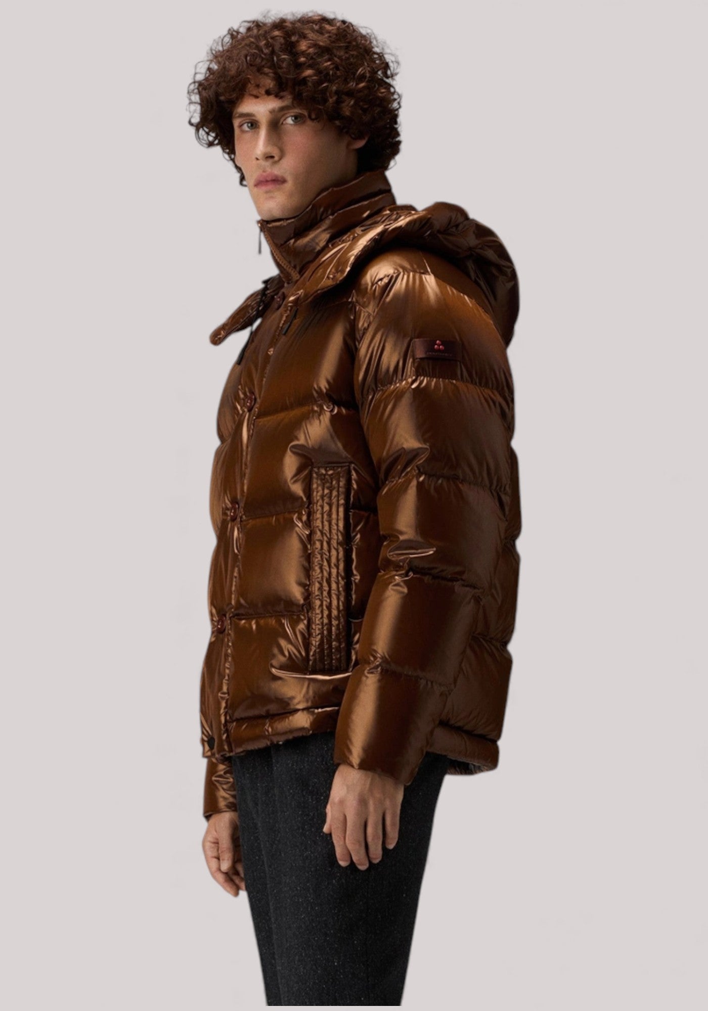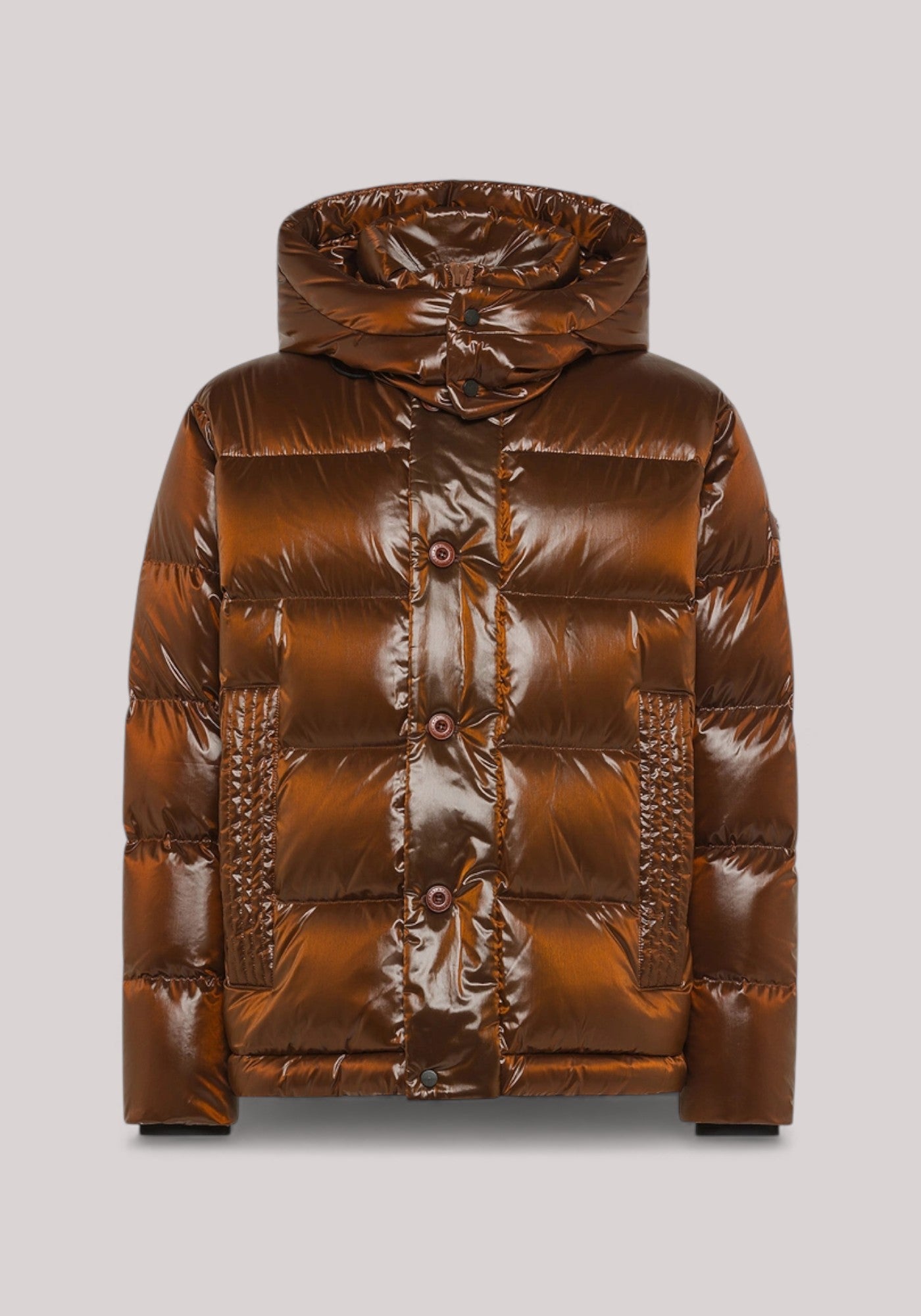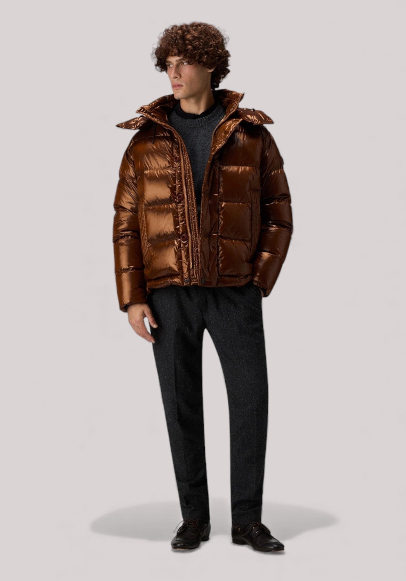 Piumino in tela di nylon 20 denari con una speciale tintura a bassa energia e un finissaggio cinzato che donano al tessuto un look lucido e cangiante, al tatto morbido e confortevole. L’imbottitura in piuma naturale certificata garantisce calore e leggerezza. Il design include zip centrale coperta da patta con bottoni, tasche a filetto con dettaglio multimpunturato e ampio cappuccio fisso con bottoni e collo in piedi per una protezione ottimale. I polsini antivento siglano ulteriormente la protezione dal freddo, mentre il trattamento idrorepellente PFC Free offre una difesa efficace contro la pioggia senza l’uso di sostanze chimiche dannose. Un capo dall’effetto visivo unico e distintivo, pensato per chi cerca stile e carattere nelle sfide quotidiane.
