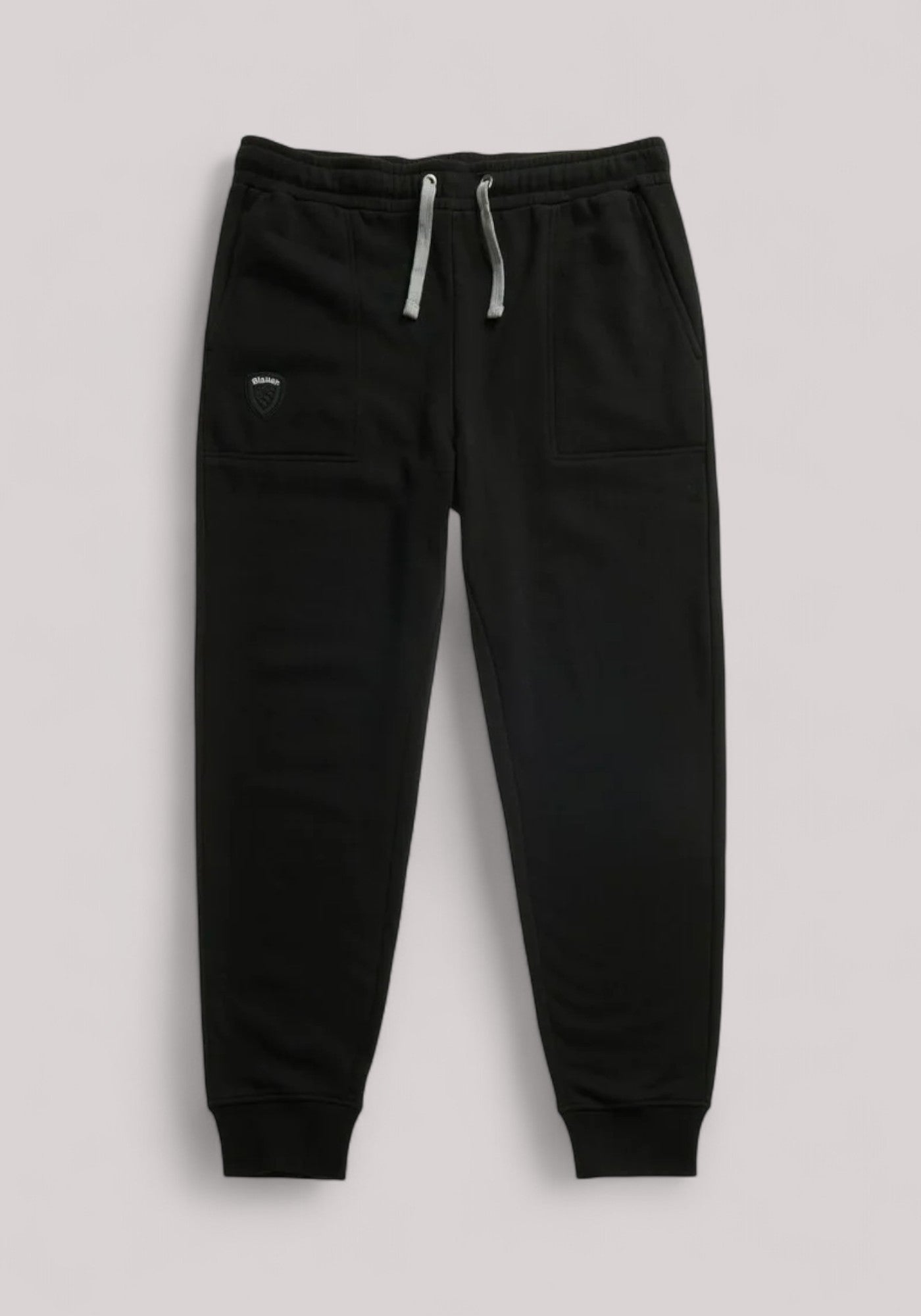 Pantalone lungo in felpa con coulisse in contrasto colore. Decoro con fettuccia in contrasto colore nella taschina dietro.