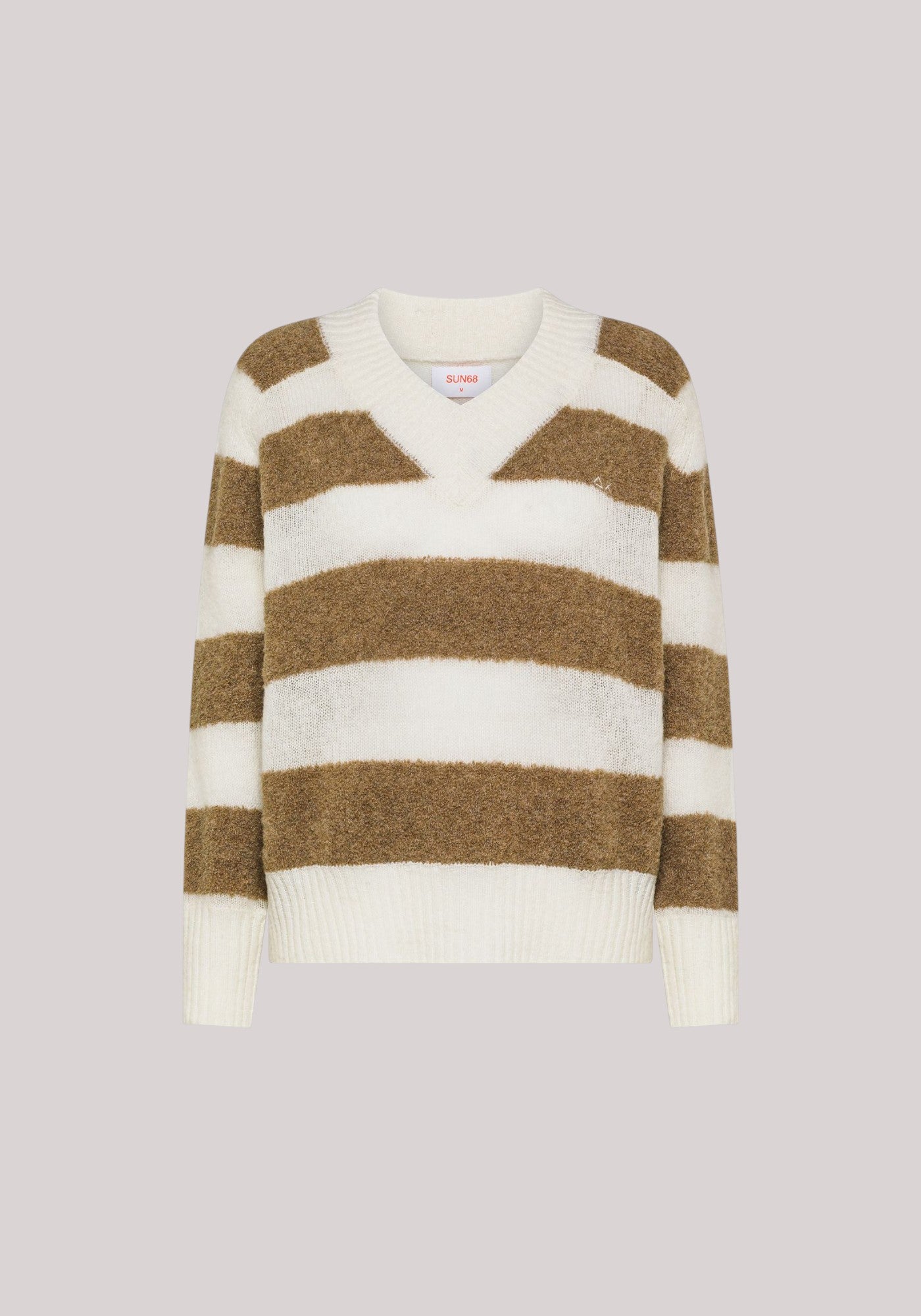 MAGLIA DONNA IN LANA E ALPACA DESERTO/BIANCO PANNA - V NECK STRIPES L/S K45266 1731