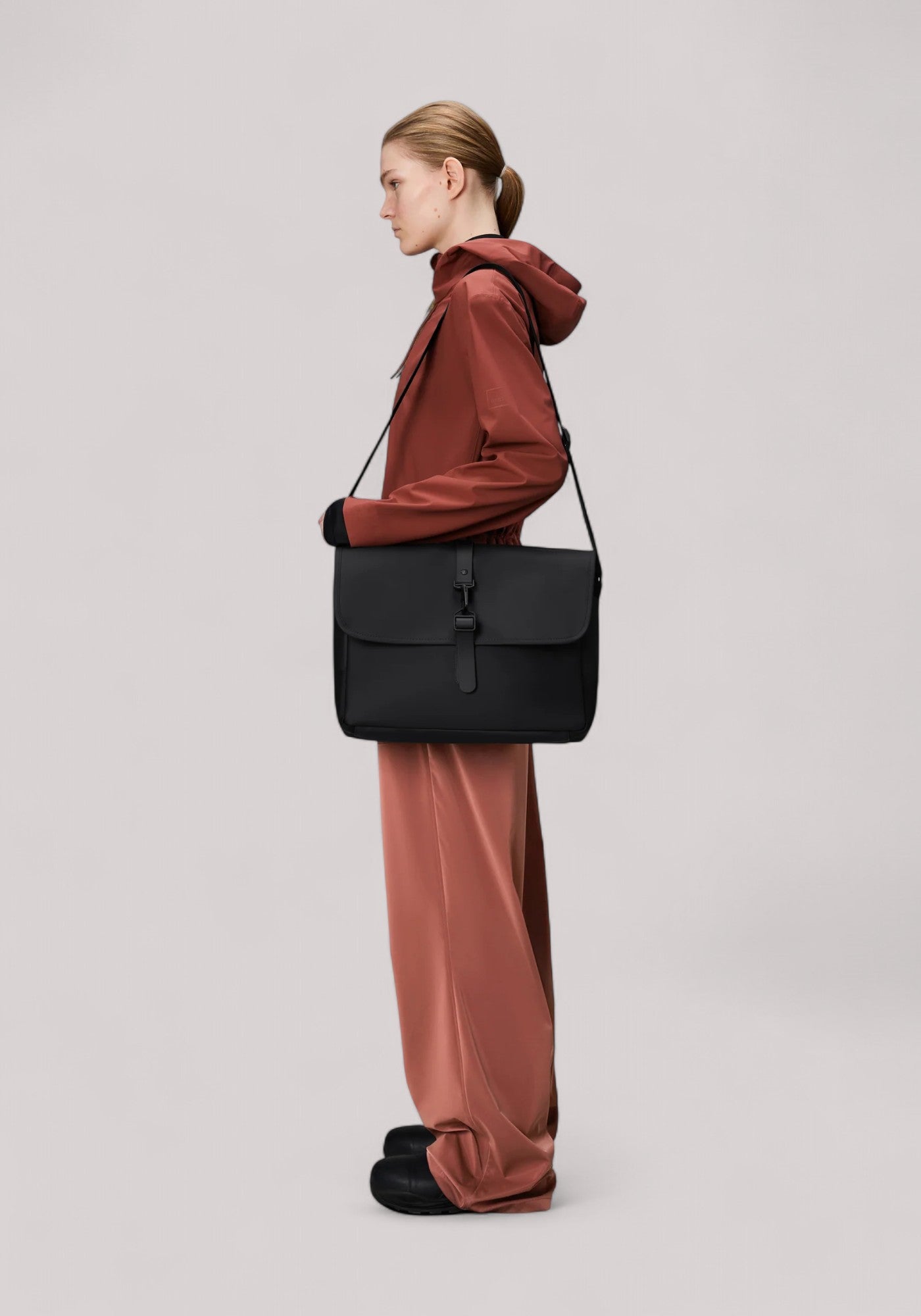 La Messenger Bag è realizzata nell'iconico tessuto PU di Rains, progettato per essere robusto, duraturo e piacevole al tatto.