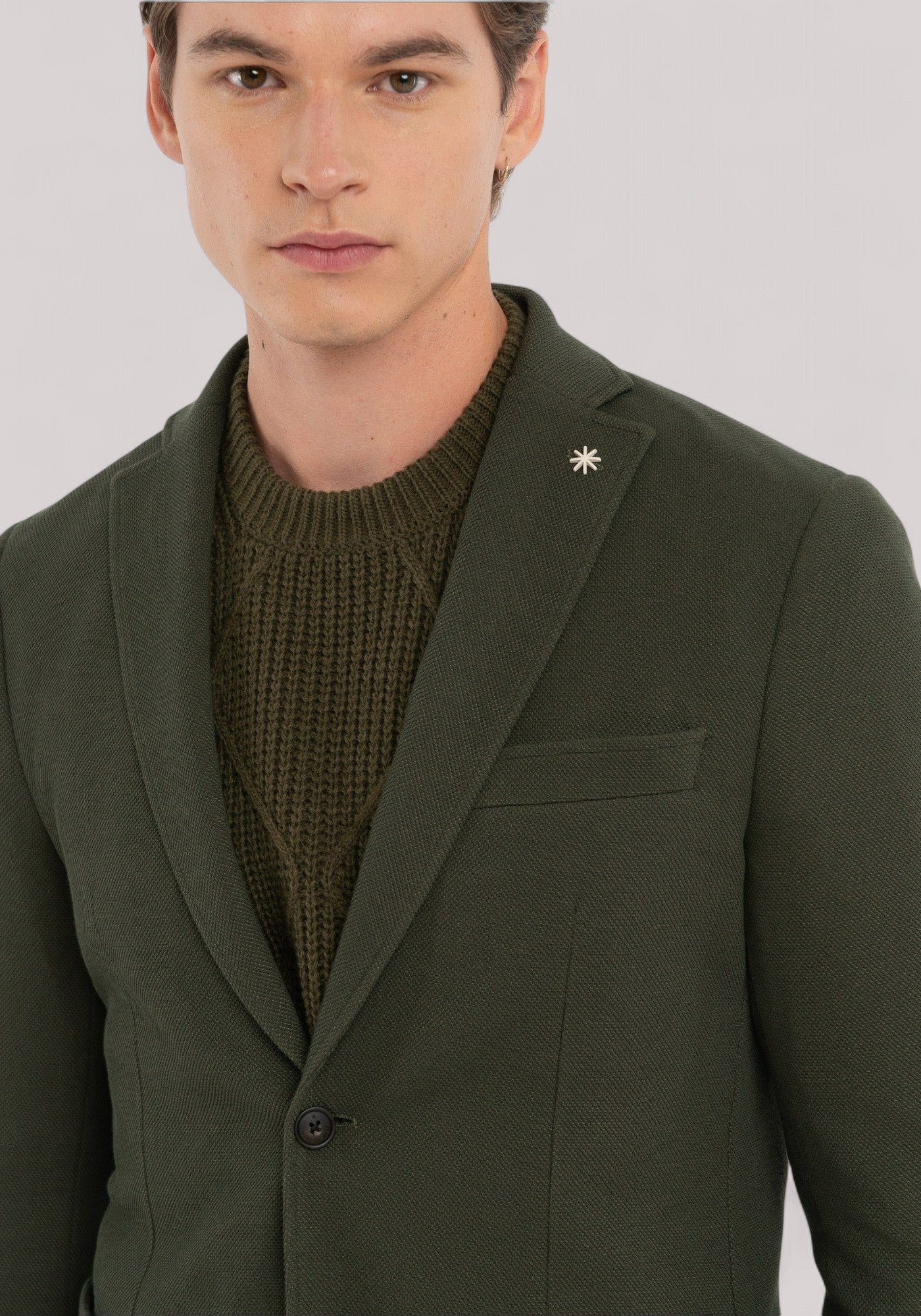 Giacca semifoderata in jersey, chiusura due bottoni, due tasche a toppa e un taschino frontali, due spacchi sul retro, quattro bottoni ai polsi, finiture con impunture. Piquet in misto cotone stretch