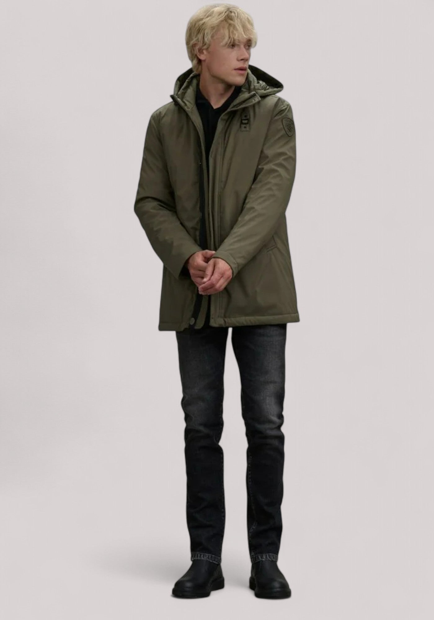 Parka lungo in neoprene liscio idrorepellente con collo alto removibile tramite zip. Imbottitura naturale calda ma non ingombrante. Capo iconico Blauer ad inspirazione militare.