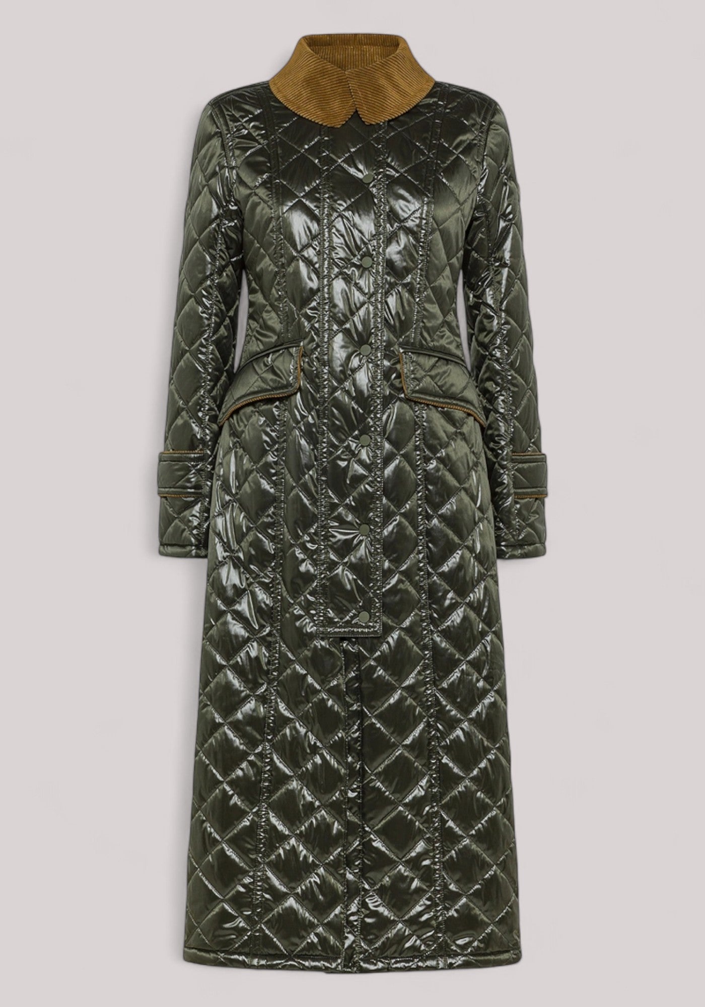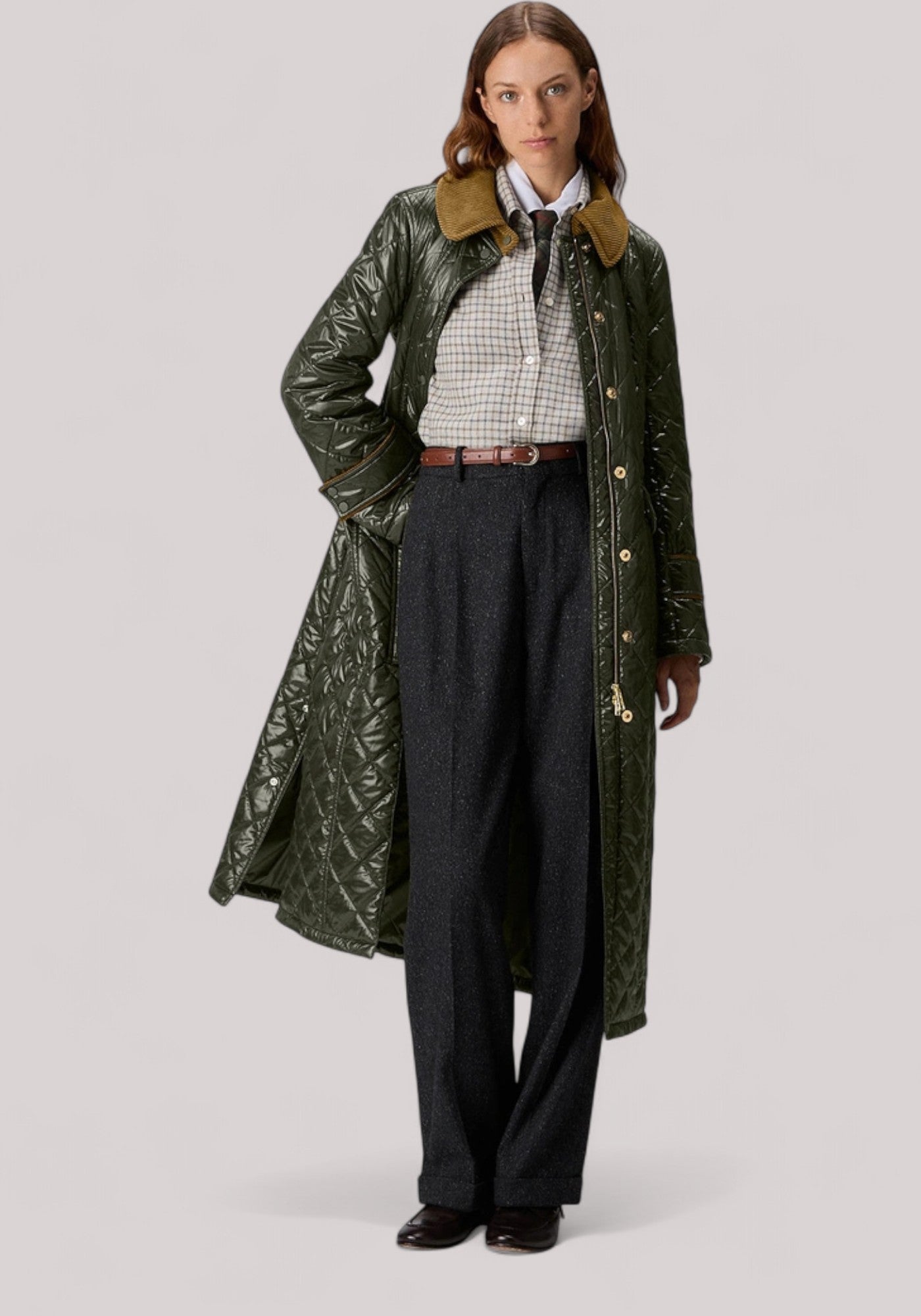 Cappotto trapuntato lungo in tela di nylon 20 denari con tintura a bassa energia e finissaggio cinzato che conferiscono al tessuto un effetto lucido e cangiante, unito a una mano morbida e confortevole. Il modello ha un’elegante shape a sirena. La trapunta matelassé sottolinea la silhouette, mentre il colletto in velluto a costine, in contrasto colore, aggiunge una nota rétro sofisticata. La zip centrale è nascosta da una patta con bottoni per un look ordinato e ricercato. L’imbottitura è in materiale sintetico e il tessuto è trattato con finitura idrorepellente PFC Free, priva di sostanze chimiche dannose per l’ambiente. Novità di stagione della linea Countryside, che rivisita i classici britannici con una visione moderna e femminile, ispirata ai paesaggi autunnali delle Highlands. Questo capo risulta perfetto per le occasioni più esclusive, per chi cerca stile, innovazione tessile e dettagli couture.