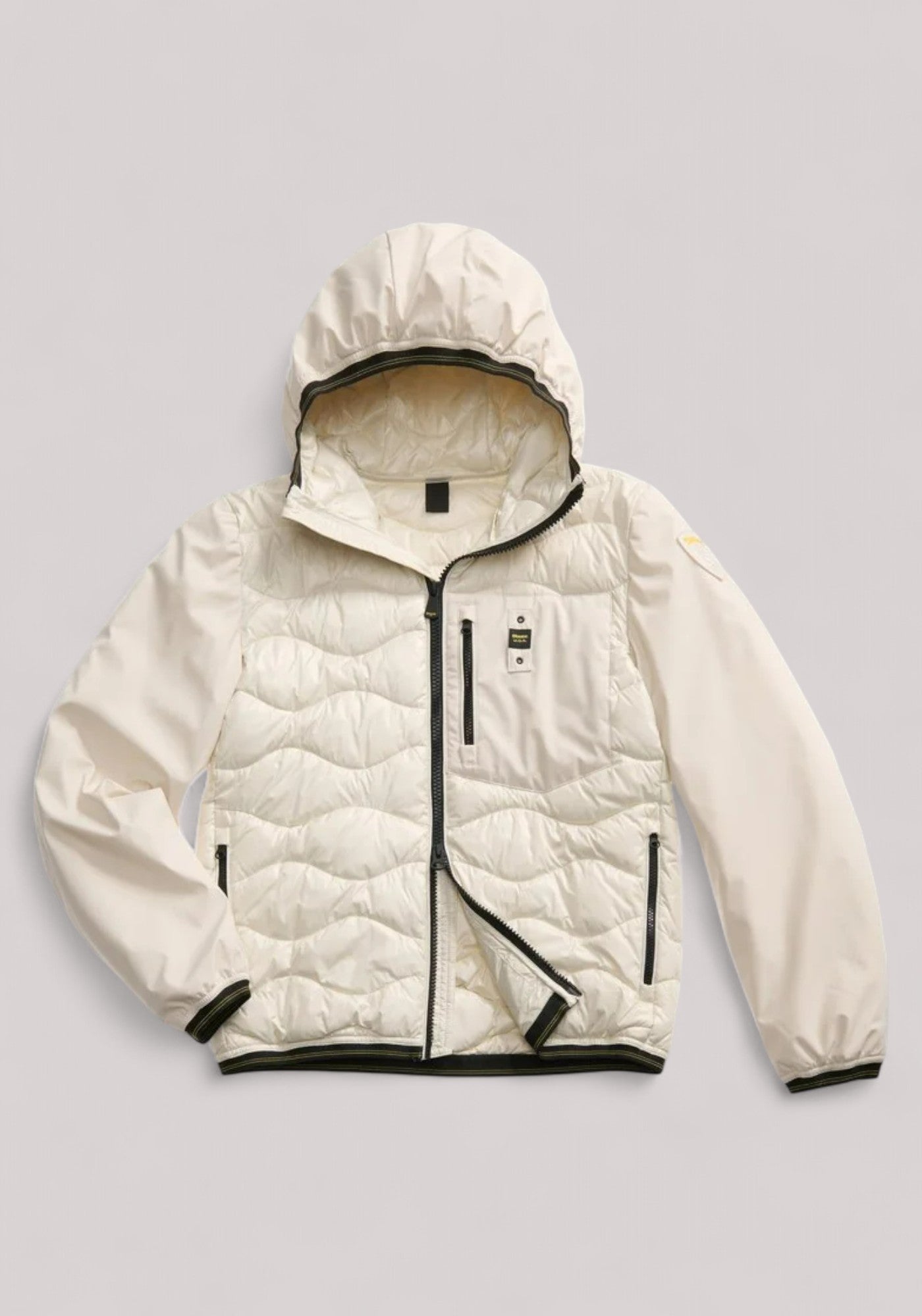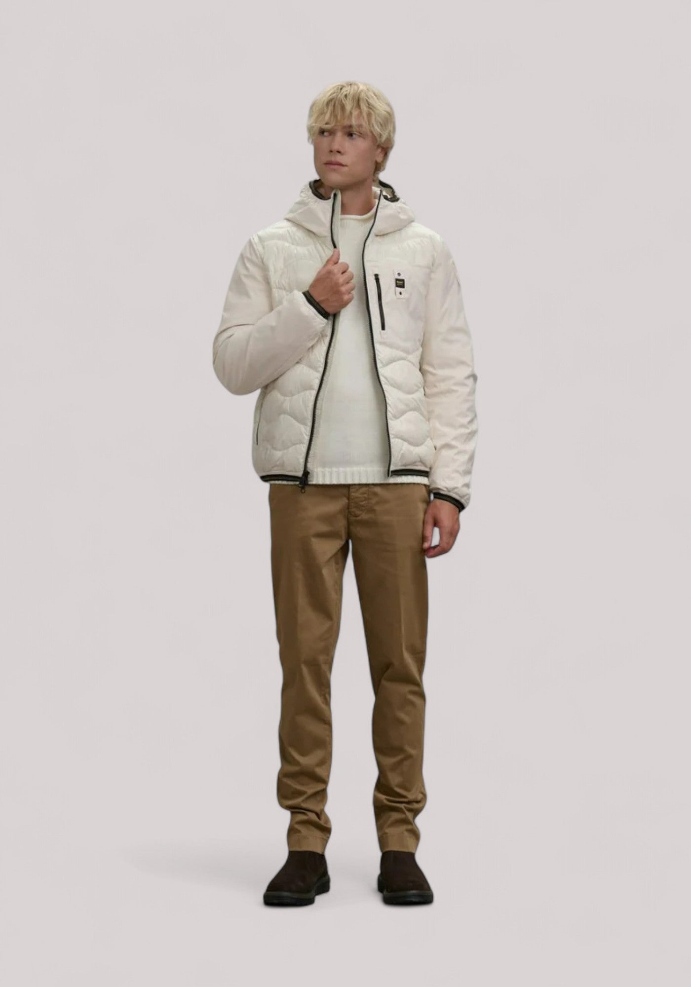 Piumino monocromatico in neoprene leggero e liscio sulle maniche e in nylon lucido impunturato ad onde sul corpo. Imbottitura mista per avere caldo anche in condizioni meteo avverse.